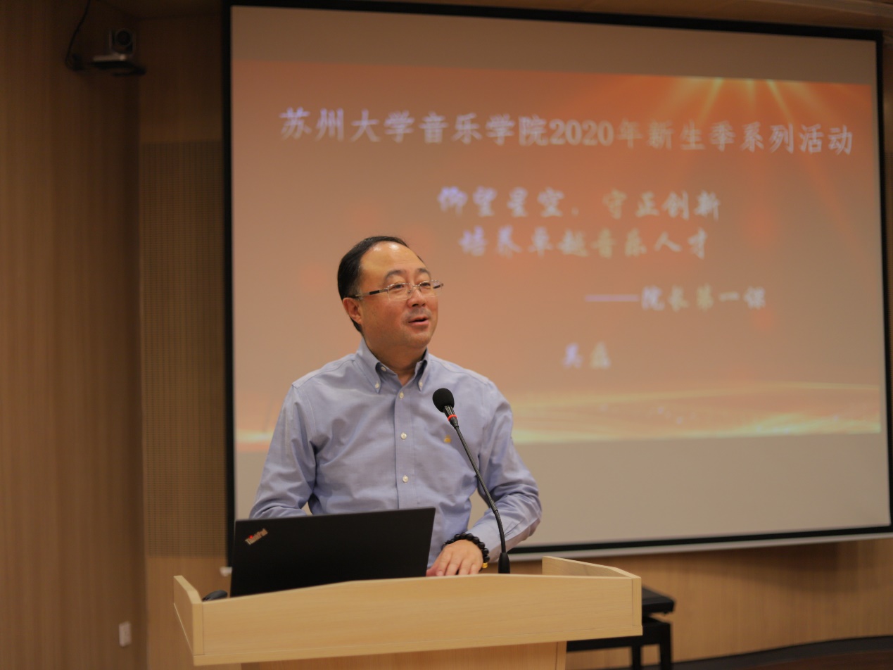 吴磊院长在新生第一课中,代表学院对大家的加入表示衷心的祝贺和热烈的欢迎,并为同学们讲授了2020年的特殊含义以及背后蕴含的中华民族伟大精神,让新生们对抗疫精神、东吴校史以及音乐精神有了更深刻的认识。