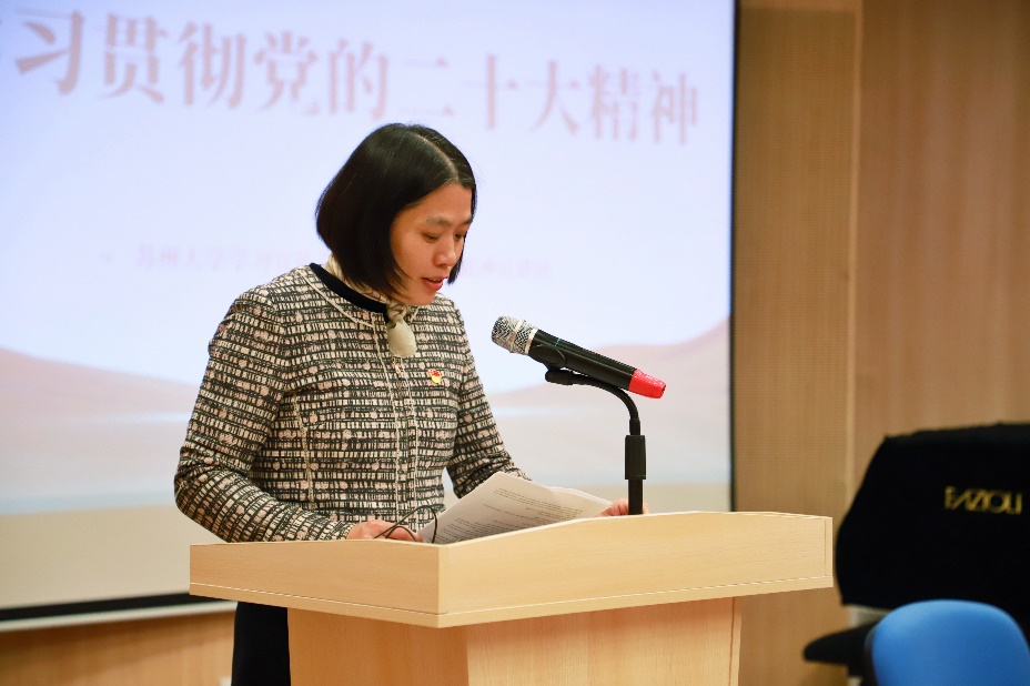 胡晓玲在主持宣讲报告会时表示,学院党委将把深入学习宣传贯彻党的二十大精神作为当前和今后一个时期的首要政治任务抓紧抓实,要以此次宣讲为契机,全院上下迅速掀起学习宣传贯彻党的二十大精神的热潮。全院师生都要深刻认识党的二十大具有的重大现实意义和深远历史意义,要提高政治站位,凝聚思想共识。深刻领悟“两个确立”的决定性意义,增强“四个意识”,坚定“四个自信”,做到“两个维护”,自觉把思想统一到党的二十大精神上来。要把学习领会党的二十大精神与谋划当前和今后一段时期的工作、学习相结合,学深、弄懂、悟透。要将党的二十大精神贯彻落实到学院具体工作实践中、落实到学习生活中,不断提高履行职责使命的能力和本领,做到对党绝对忠诚,勇于实干担当,为学院高质量发展做出更大贡献。