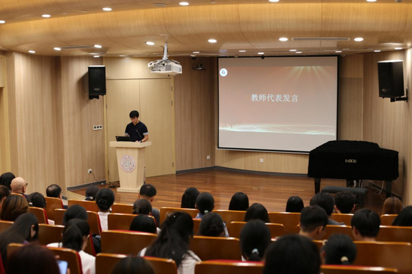 薛驭生老师代表全体教师发言,通过“技能树”“平衡生活”和“内驱力”三大要点,帮助新生开启大学生活。他鼓励新生们勇敢尝试、不断探索,积极点亮各类专业和生活技能。同时,他强调了学业与生活之间的平衡,并鼓励同学们找到真正的内在动力,保持长久的热情,勇敢面对未来的挑战。