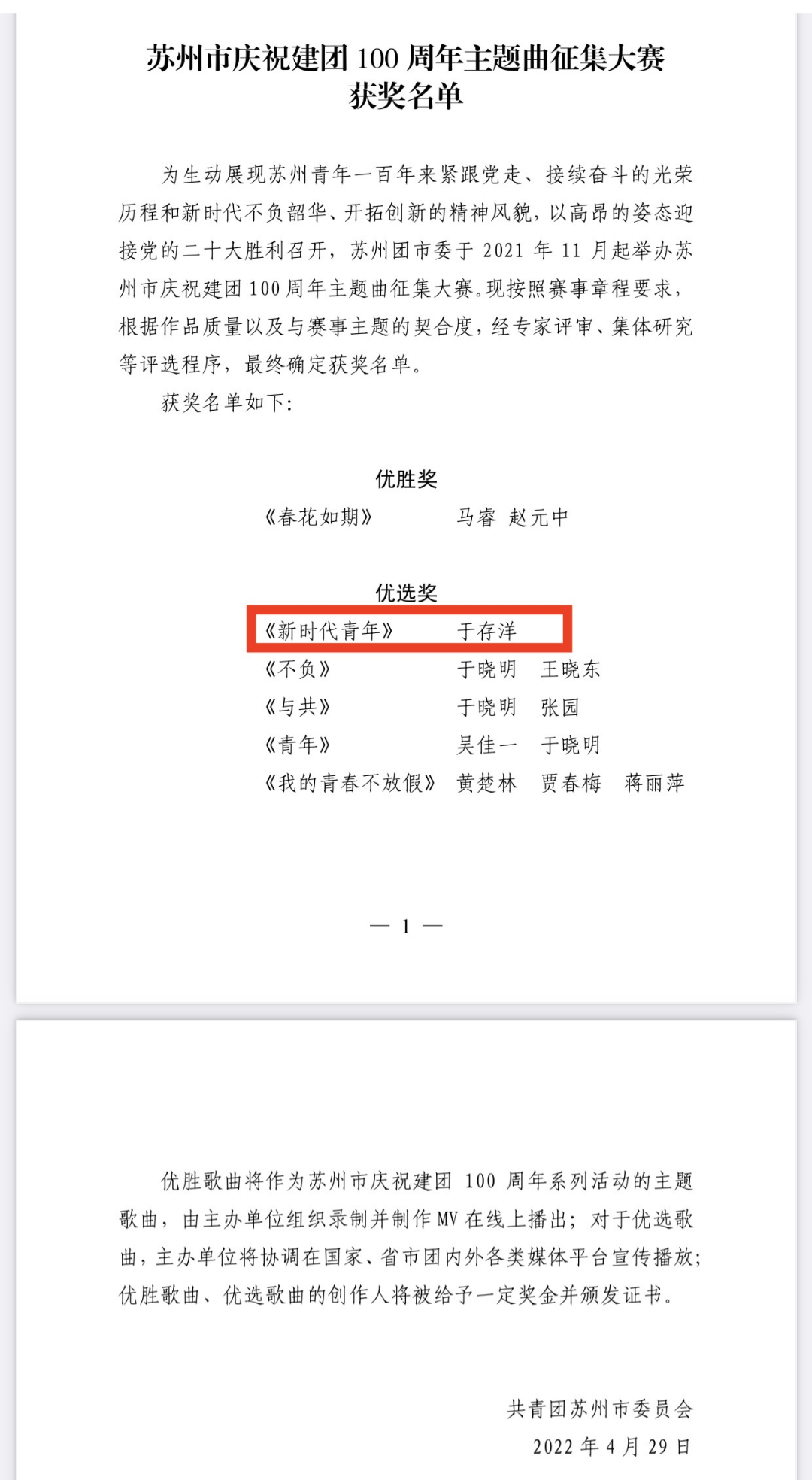 久久小说 团委书记于存洋原创歌曲《新时代青年》通过欢快的旋律唱出了百年来,一代又一代中国青年紧跟党走、接续奋斗,在青春赛道上奋力奔跑,用汗水谱写一曲又一曲青春之歌的勇敢与担当,展现了新时代青年开拓创新、勇于追梦、昂扬向上的精神风貌。歌曲获苏州市庆祝建团100周年主题曲征集大赛“优选奖”。