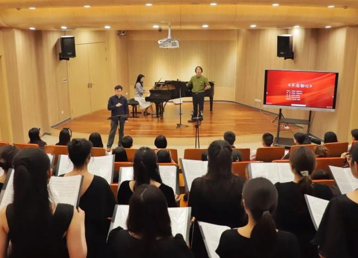 学院学工办主任、本科生党支部书记张晶作为讲述人,从百姓日常生活场景切入,以小见大反映中国共产党成立百年以来领导中国人民取得的伟大成就。在以习近平同志为核心的党中央领导下,我们坚守信仰,奋发图强,为实现中华民族伟大复兴的中国梦不懈奋斗。由李长松老师指挥,星空女声合唱团演唱的《灯火里的中国》,表达了人们对祖国的美好祝福。最后,由李长松老师指挥,唐明务老师领唱,星空女声合唱团演唱的《不忘初心》更是将本次党课推向了高潮。精神在旋律中展现,党性在音乐中升华。“不忘初心,继续前进,万水千山最美中国道路”,伴随着悠扬的歌声,一堂“声”入人心的音乐党课圆满结束。