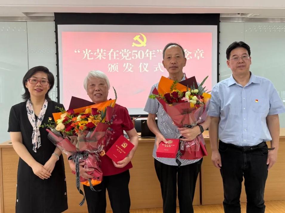 在庄重而温馨的“光荣在党50年”纪念章颁发仪式上,王云杰副校长为老党员葛云林、潘兰娣佩戴纪念章。这一枚枚纪念章,承载着老党员们数十年如一日对党的忠诚与奉献。白发与青春交汇,勋章与党徽相映,学生党员在掌声中见证“一生跟党走”的赤诚誓言。