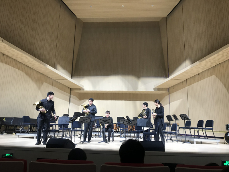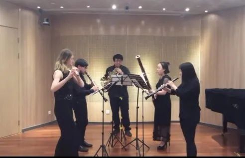 除圆号重奏,圆号班也积极与其他器乐合作室内乐组合演出。图为贺子峰同学与其他学生组成的Danzi Haas wind quintet。