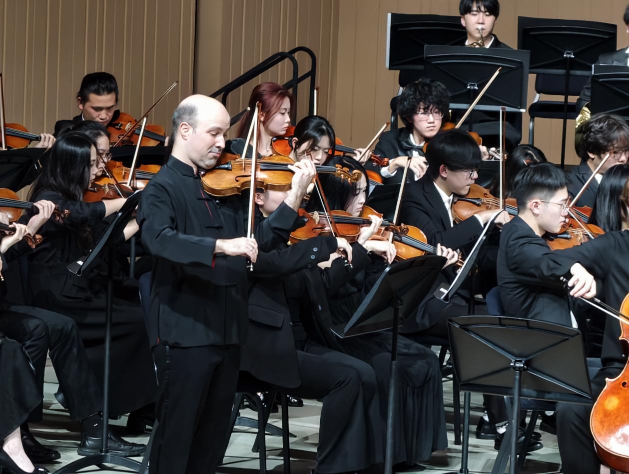 音乐会在贝多芬的《雷奥诺拉序曲第三号,作品72b》中拉开帷幕,激昂的旋律瞬间点燃了现场气氛。随后,交响乐团演绎了《F大调第八交响曲,作品93》,以精湛的技艺展现了贝多芬音乐特有的力量与美感。音乐会的压轴之作《C大调三重协奏曲,作品56》由久久小说 外籍教师Guillaume Molko、Leon Hillebrands和Angela Cholakian联袂出演,三位音乐家的默契配合,将此曲的丰富内涵表现得淋漓尽致,赢得观众持久的热烈掌声。