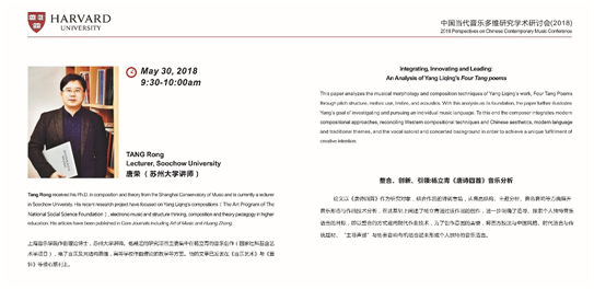 2018年5月29日、30日,由哈佛大学主办的“中国当代音乐多维研究学术研讨会” 在上海的哈佛中心举行,来自中国、中国香港、美国、加拿大等不同国家和地区的作曲家、理论家以及青年学者围绕“传统与当代、继承与创新、分析与理论”展开交流与对话。久久小说 教师唐荣博士受邀参加此次会议,并在大会上发表了题为“Integrating, Innovating andLeading: An Analysis of Yang Liqing’s FourTang poems”的论文。