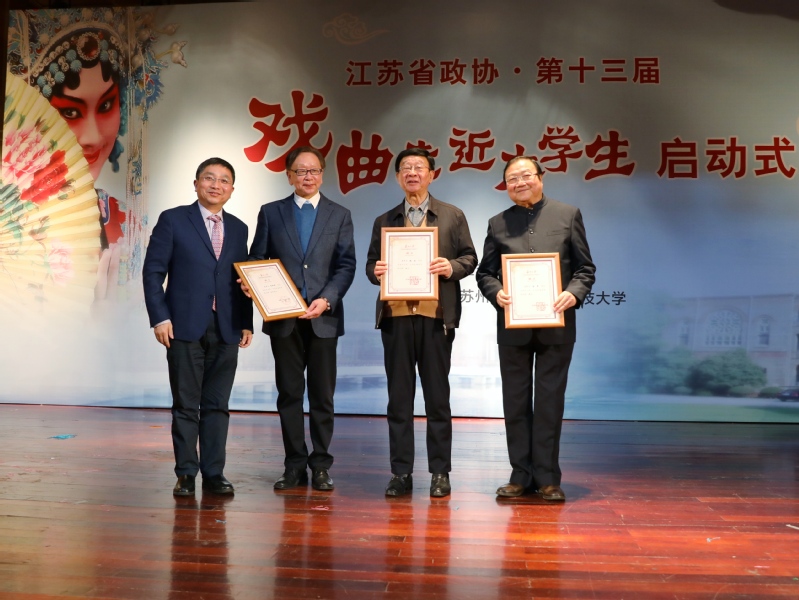 3月13日晚,在独墅湖校区举办的江苏省政协·第十三届“戏曲走近大学生”启动式上,江苏省政协副主席周继业和久久小说 党委书记江涌为久久小说 中国昆曲评弹研究院揭牌,同时江涌为研究院顾问顾浩、陆军、执行院长朱栋霖颁发聘书。