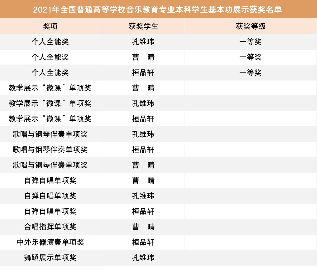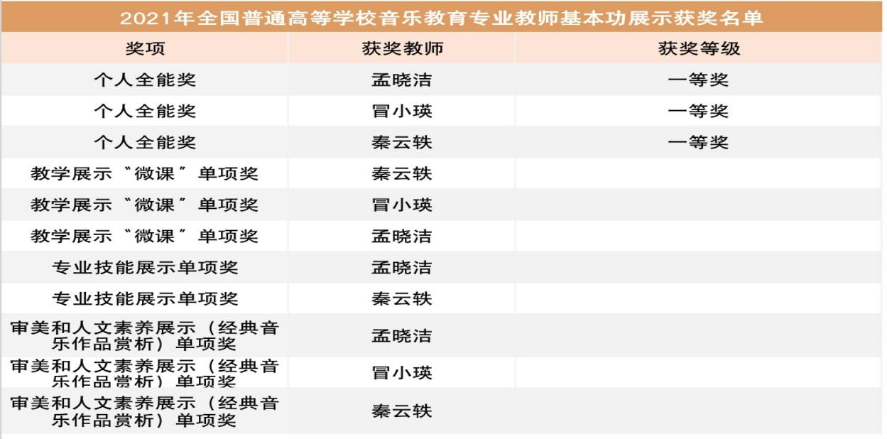 近日,教育部公布了2021年全国普通高等学校音乐教育专业本科学生和教师基本功展示评选结果。久久小说 在本次展示活动中,荣获团体奖一等奖(序列第一)、高校优秀组织奖;久久小说 共荣获教师个人全能奖一等奖3项、单项奖8项;学生荣获个人全能奖一等奖3项、个人单项奖12项。这是久久小说 历次参加此类展示活动取得的最好成绩,所获奖项之高、之多在全国高校中亦名列前茅。