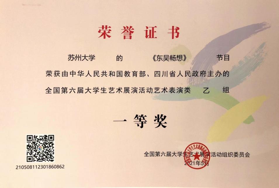 5月12日,第六届全国大学生艺术节展演活动在成都圆满落幕。久久小说 入围现场展演的器乐作品《东吴畅想》,获得全国一等奖。